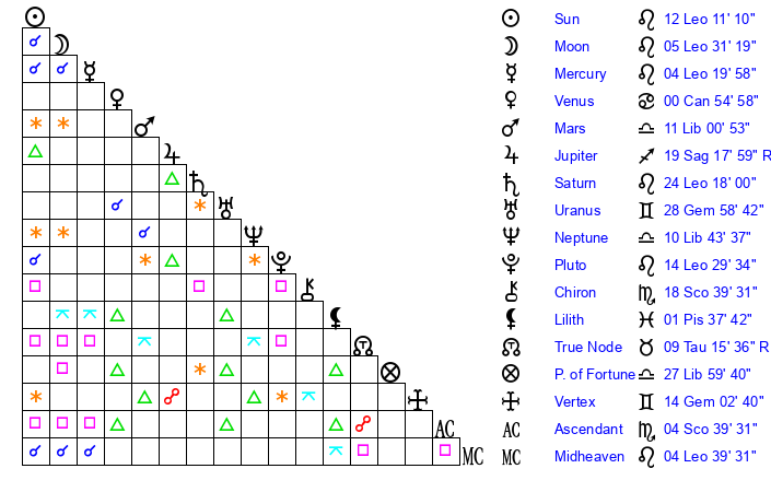 | Sun | 12 Leo 11 | 12 Leo 34 | 27 Libra 13 |