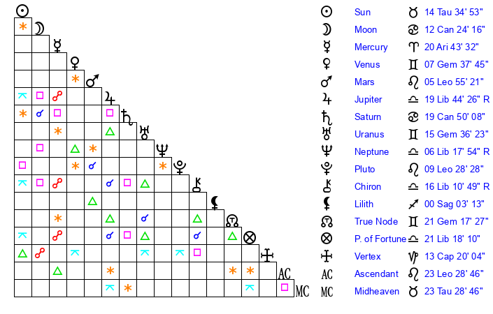 | Sun | 14 Taurus 35 | 15 Taurus 27 | 0 Leo 13 |