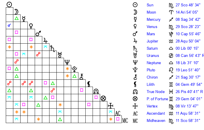 | Sun | 27 Scorpio 48 | 28 Scorpio 37 | 14 Aquarius 4 |