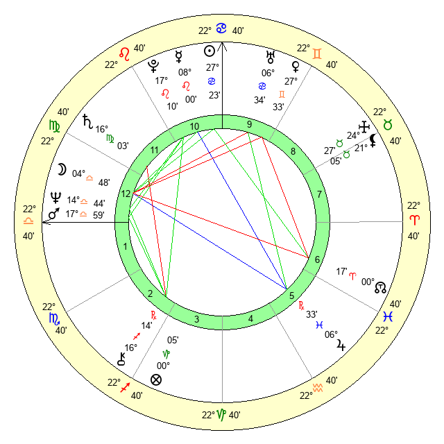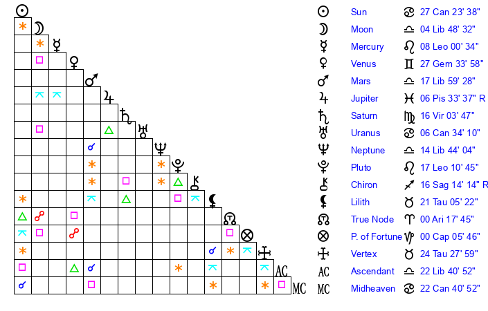 | Sun | 27 Cancer 23 | 28 Cancer 14 | 9 Libra 54 |