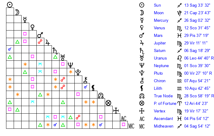 | Sun | 13 Sagittarius 33 | 13 Sagittarius 49 | 23 Aquarius 44 |