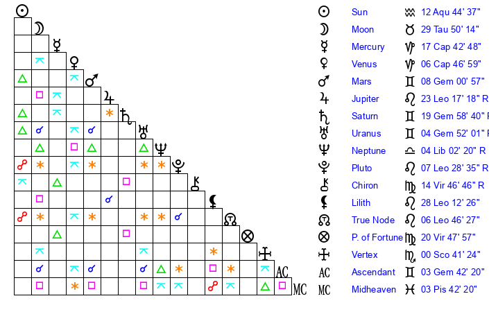 | Sun | 12 Aquarius 45 | 14 Aquarius 6 | 3 Taurus 24 |