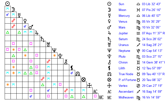 | Mars | 10 Virgo 32 | 2 Scorpio 57 | 5 Libra 41 |