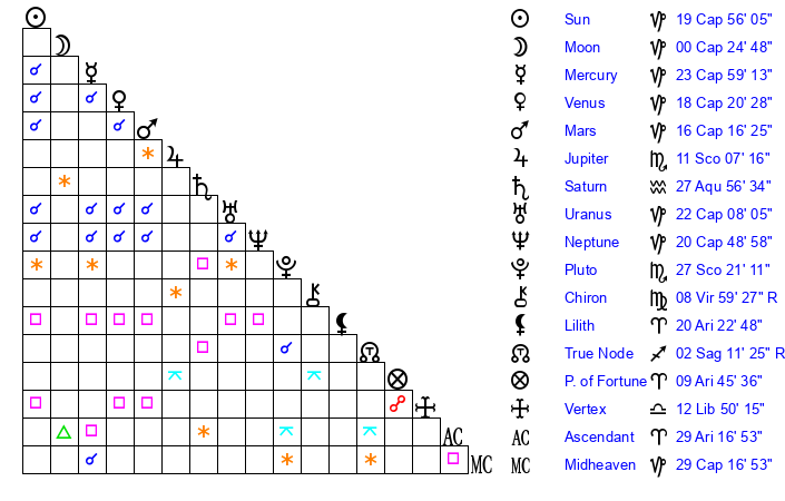 | Mars | 16 Capricorn 16 | 28 Cancer 29 | 10 Aquarius 20 |