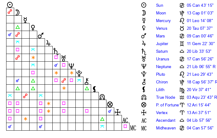 | Moon | 13 Capricorn 2 | 6 Leo 16 | 7 Virgo 59 |