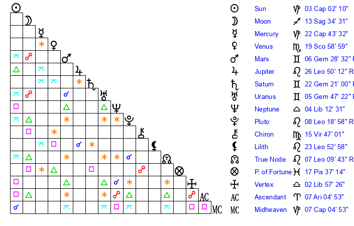 | Neptune | 4 Libra 13 | 29 Pisces 26 | 3 Libra 5 |