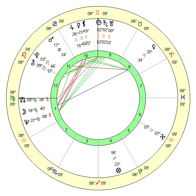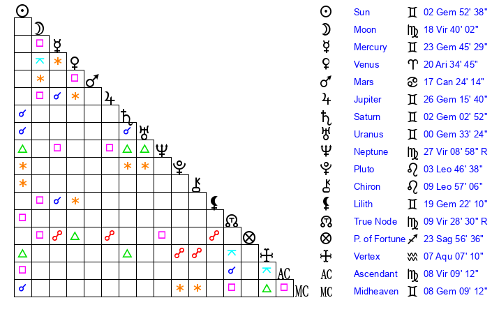 | Saturn | 2 Gemini 17 | 29 Pisces 52 | 11 Gemini 21 |
