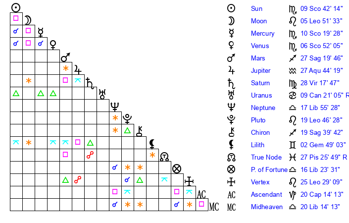 | Neptune | 17 Libra 55 | 29 Pisces 44 | 19 Libra 31 |