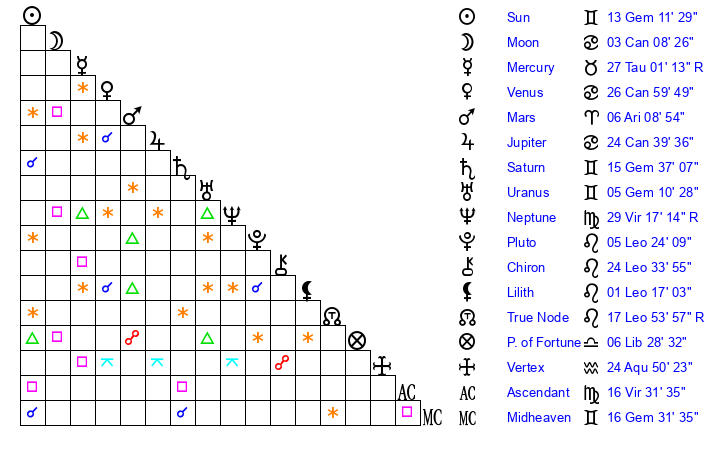 | Sun | 13 Gemini 12 | 14 Gemini 19 | 1 Virgo 37 |