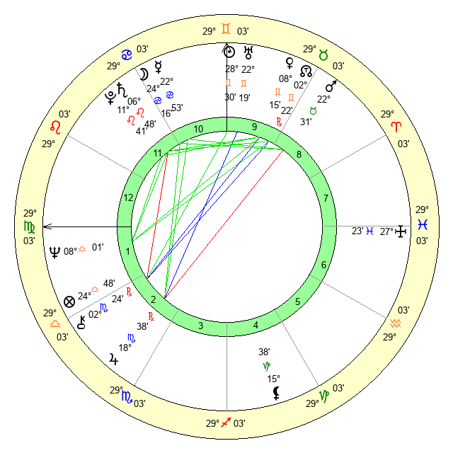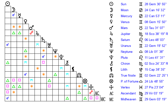 | Sun | 28 Gemini 31 | 29 Gemini 37 | 13 Virgo 15 |