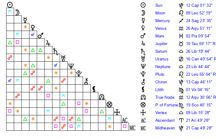 | Pluto | 22 Leo 54 | 2 Aquarius 46 | 21 Leo 17 |
