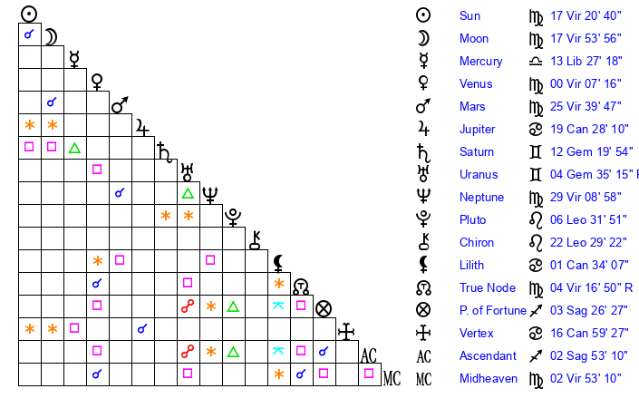 | Sun | 17 Virgo 20 | 18 Virgo 14 | 9 Sagittarius 54 |