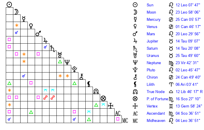 | Moon | 23 Leo 54 | 17 Sagittarius 34 | 4 Libra 1 |