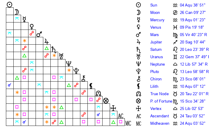 | Moon | 26 Cancer 14 | 18 Sagittarius 48 | 17 Taurus 20 |