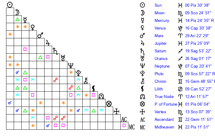 | Sun | 0 Pisces 31 | 1 Pisces 18 | 8 Aries 28 |