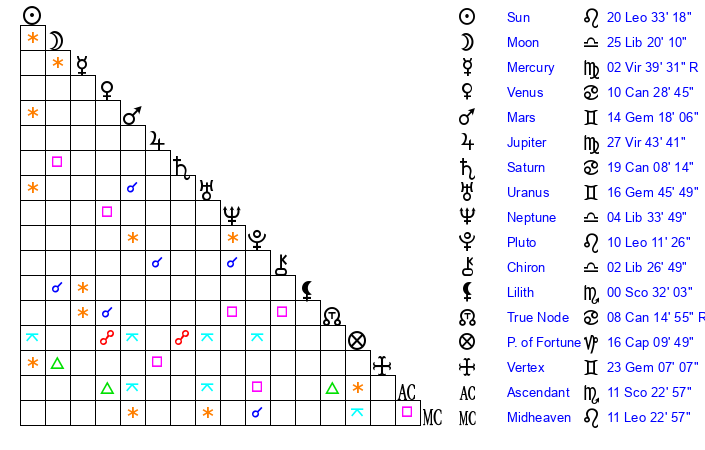 | Sun | 20 Leo 33 | 21 Leo 12 | 8 Scorpio 55 |