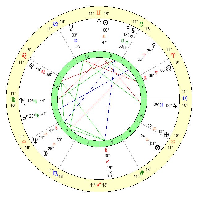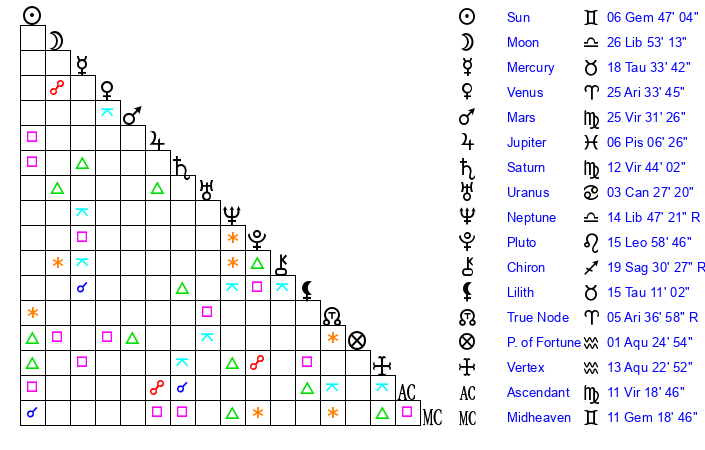 | Moon | 27 Libra 1 | 29 Gemini 42 | 24 Cancer 19 |