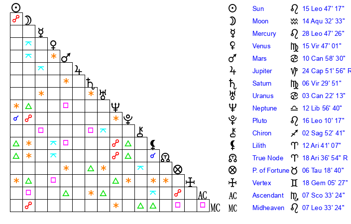 | Pluto | 16 Leo 10 | 2 Aquarius 14 | 18 Leo 1 |