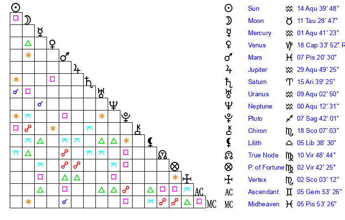 | Sun | 14 Aquarius 40 | 15 Aquarius 7 | 11 Pisces 55 |