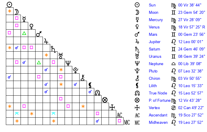 | Moon | 24 Gemini 1 | 18 Virgo 54 | 23 Gemini 30 |