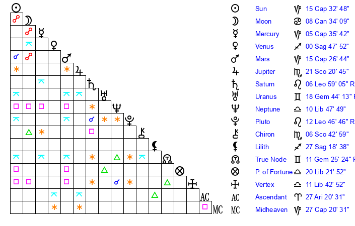 | Pluto | 12 Leo 46 | 2 Aquarius 53 | 11 Leo 8 |