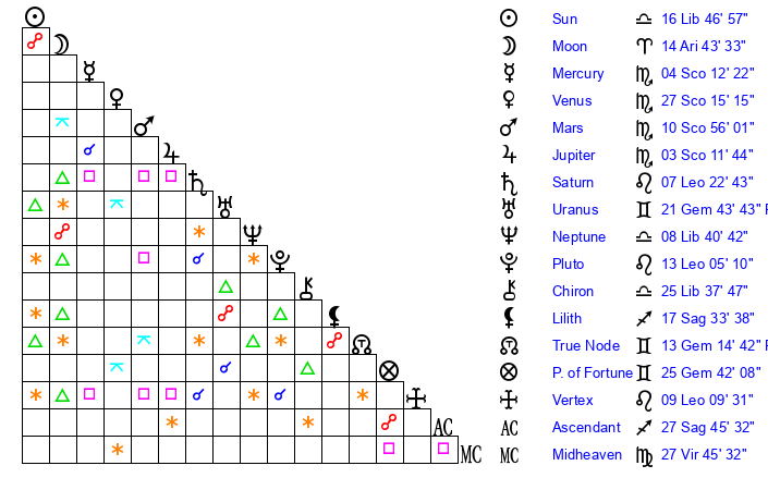 | Moon | 14 Aries 36 | 7 Gemini 2 | 3 Pisces 15 |