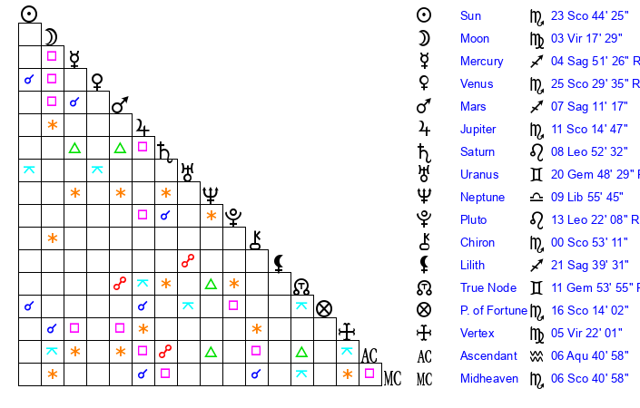 | Sun | 23 Scorpio 45 | 24 Scorpio 35 | 14 Aquarius 2 |