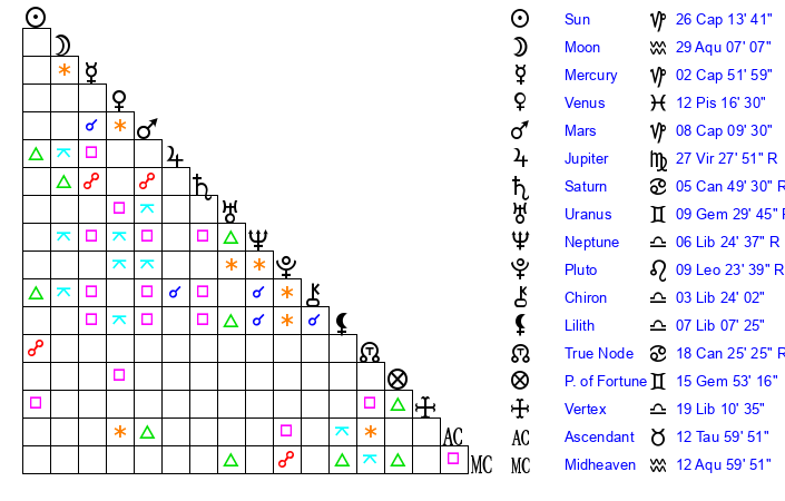 | Moon | 29 Aquarius 1 | 0 Virgo 4 | 27 Capricorn 26 |