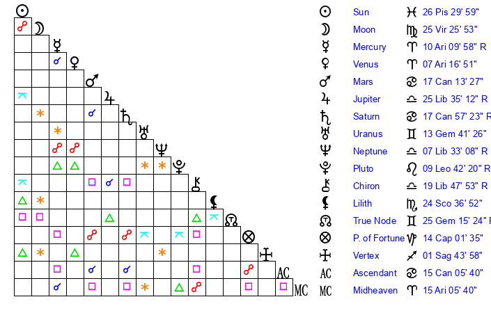 | Sun | 26 Pisces 30 | 27 Pisces 21 | 13 Gemini 27 |