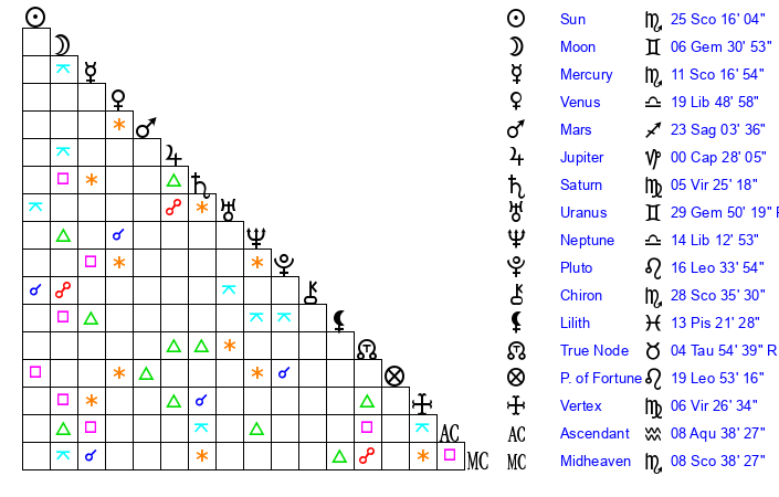 | Sun | 25 Scorpio 16 | 25 Scorpio 36 | 13 Aquarius 32 |