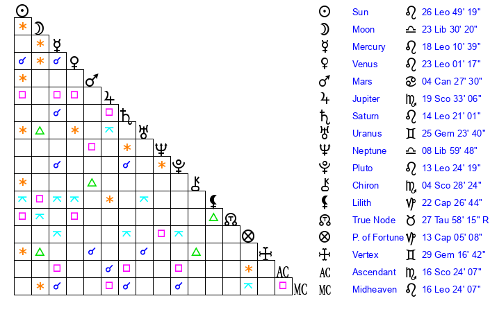 | Moon | 23 Libra 37 | 26 Cancer 17 | 26 Leo 25 |
