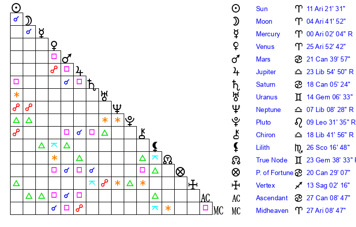 | Sun | 11 Aries 22 | 12 Aries 13 | 27 Gemini 47 |