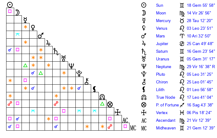 | Sun | 18 Gemini 56 | 20 Gemini 4 | 7 Virgo 24 |