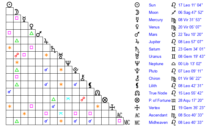 | Sun | 17 Leo 11 | 18 Leo 19 | 7 Scorpio 24 |