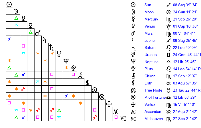 | Sun | 8 Sagittarius 40 | 9 Sagittarius 45 | 27 Aquarius 57 |