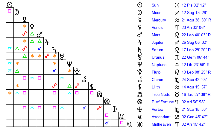 | Neptune | 12 Libra 23 | 28 Pisces 57 | 10 Libra 30 |