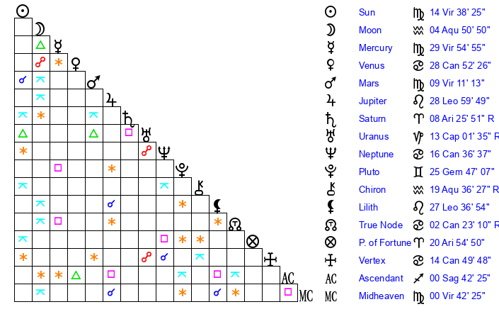 | Sun | 14 Virgo 39 | 15 Virgo 19 | 11 Capricorn 42 |