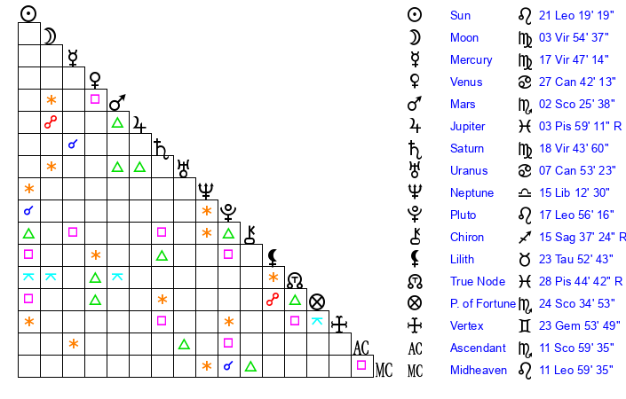 | Sun | 21 Leo 19 | 22 Leo 9 | 4 Scorpio 42 |