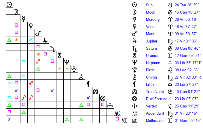 | Moon | 16 Cancer 13 | 28 Sagittarius 30 | 17 Gemini 3 |