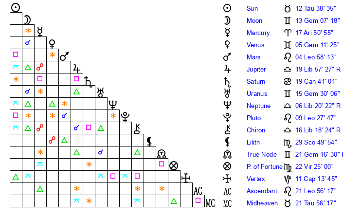 | Moon | 13 Gemini 5 | 3 Leo 9 | 26 Aries 38 |