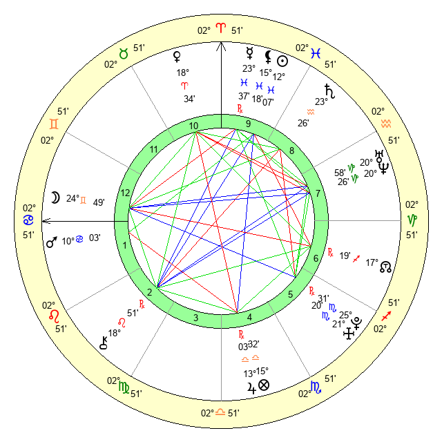 | Moon | 24 Gemini 51 | 19 Aries 6 | 0 Virgo 41 |
