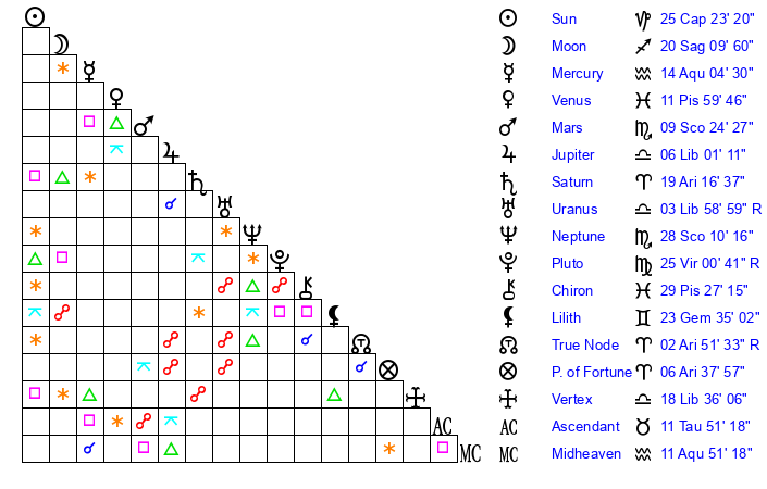 | Mercury | 14 Aquarius 4 | 10 Capricorn 38 | 0 Pisces 6 |