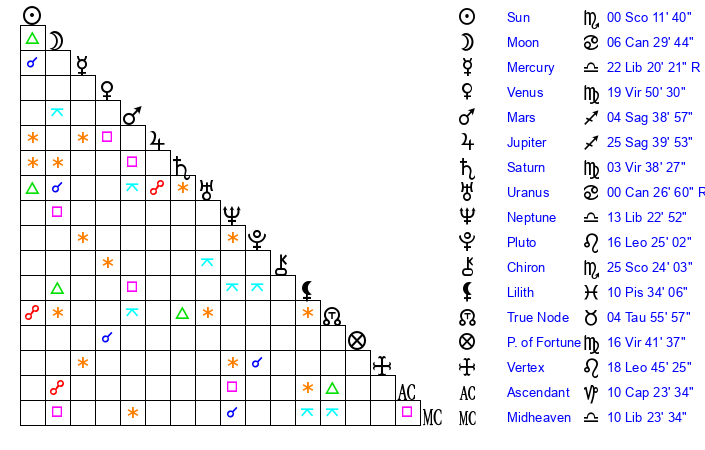| Neptune | 13 Libra 23 | 29 Pisces 57 | 15 Libra 9 |
