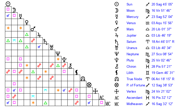 | Sun | 20 Sagittarius 45 | 21 Sagittarius 10 | 17 Aquarius 45 |