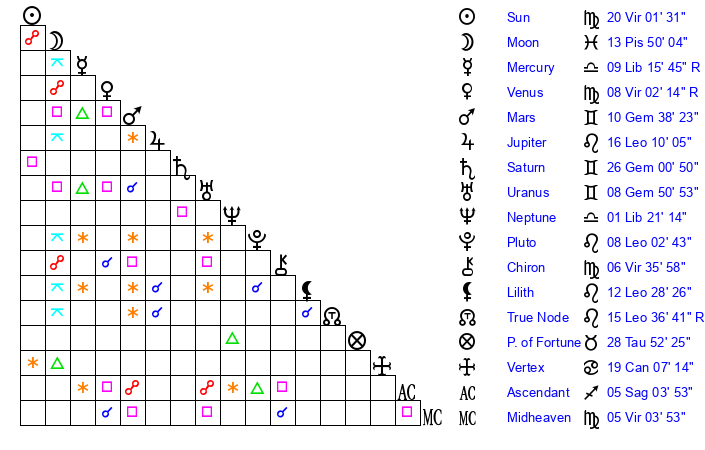 | Sun | 20 Virgo 1 | 21 Virgo 9 | 11 Sagittarius 41 |