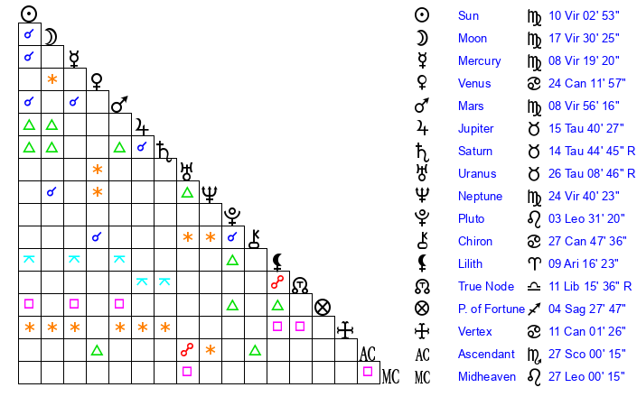 | Moon | 17 Virgo 23 | 7 Capricorn 50 | 27 Libra 49 |