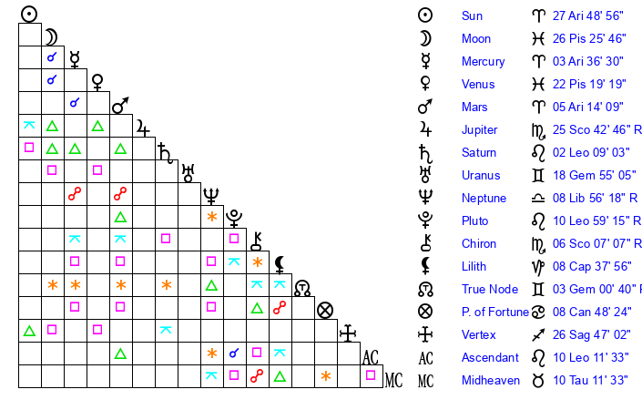 | Pluto | 10 Leo 58 | 3 Aquarius 45 | 12 Leo 3 |