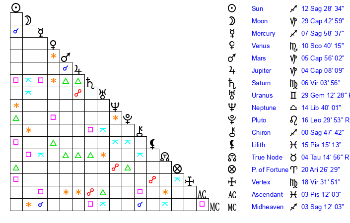 | Saturn | 6 Virgo 33 | 25 Pisces 6 | 3 Virgo 30 |