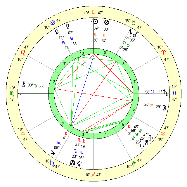 | Sun | 9 Gemini 36 | 10 Gemini 5 | 9 Cancer 13 |
