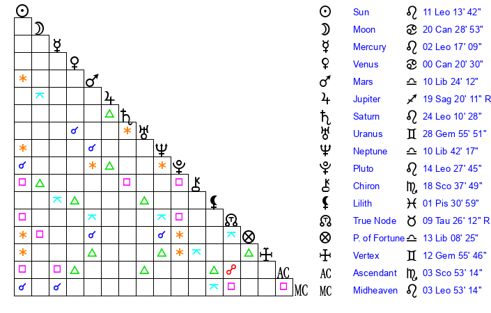 | Jupiter | 19 Sagittarius 13 | 12 Cancer 18 | 24 Sagittarius 54 |